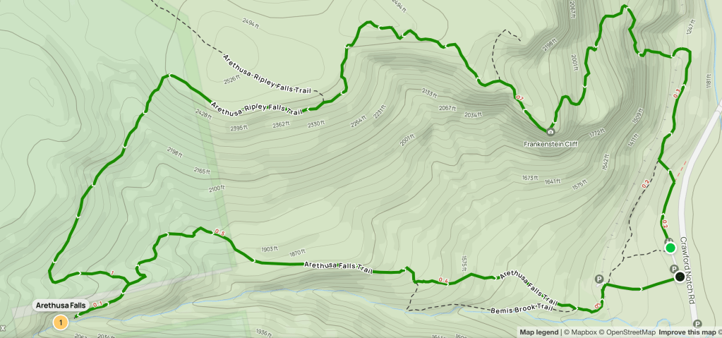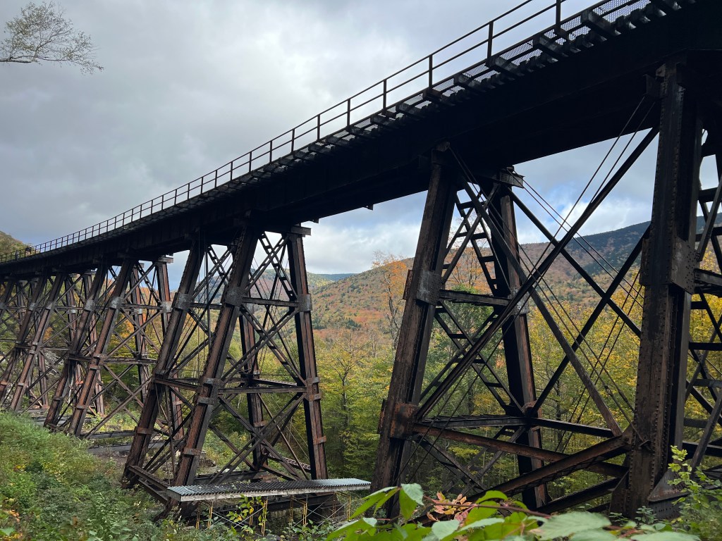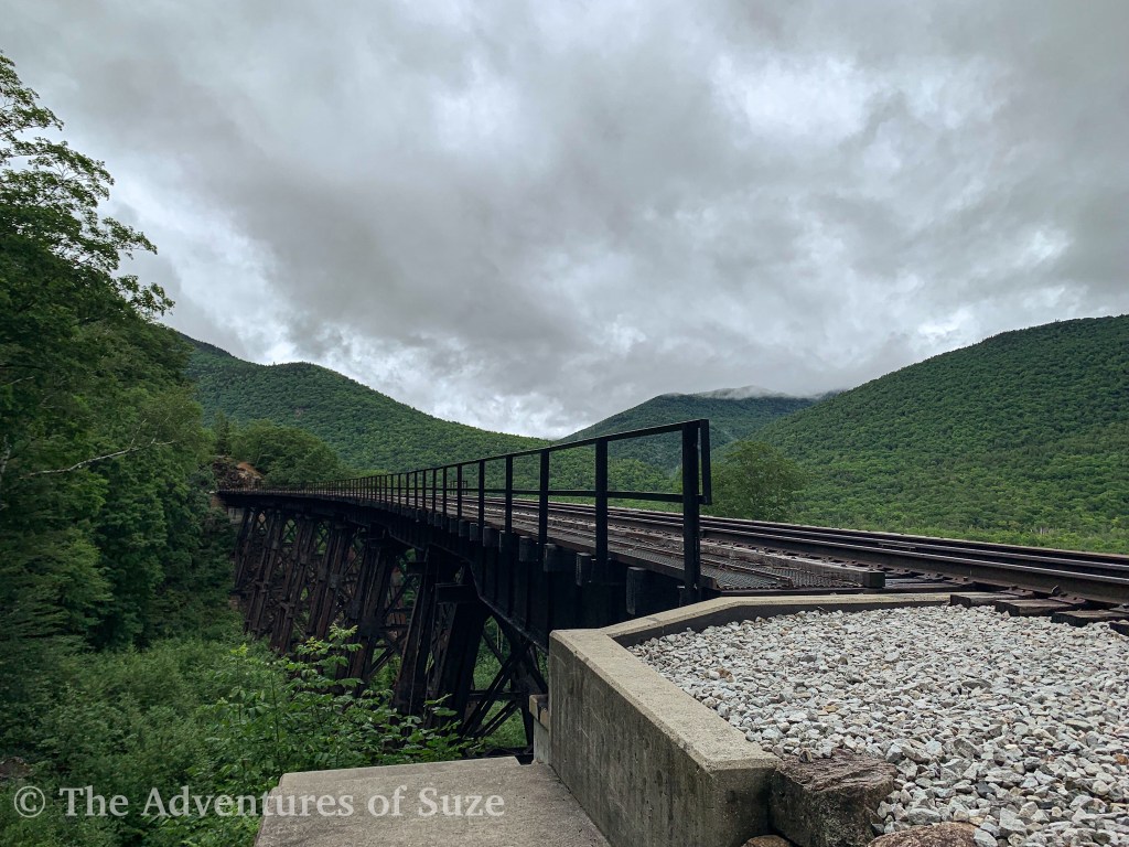 This is a fun loop in Hart’s Location, New Hampshire, located in Crawford Notch State Park. It’s about 5 miles long and about 1,600 feet in elevation. I’ve hiked this twice now, once in the summer and once in the fall. I enjoyed the hike both times I visited. I will say the beginning of the hike isn’t that well-marked and both times I’ve done the hike, I’ve gotten turned around within the first half mile. Both times I ended up walking along the train tracks but it did offer beautiful views of the Frankenstein Trestle. Using AllTrails also helped me get back on track!