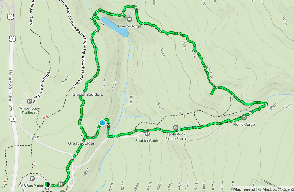 This is an easy trail in Franconia Notch State Park in New Hampshire and can be found on AllTrails. This is a very popular destination as it’s doable for people of all ages. You do have to buy tickets for entry which can get pricey if going with a family but I do think it’s worth it!