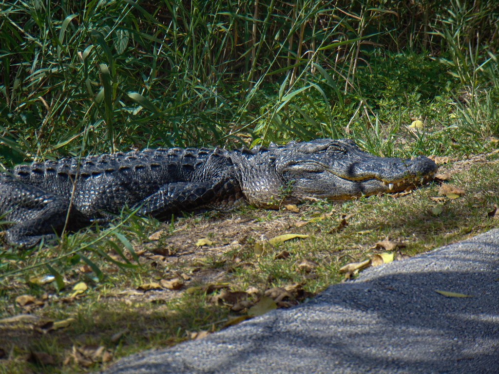 Everglades Safari Park was about 40 minutes to an hour from Homestead. Near the park was one of the National Parks visitors center – Shark Valley. We had planned on going there Thursday morning but since we were already out that direction on Wednesday, we decided to head there next. We had made bike reservations for Thursday and we were able to switch them to Wednesday afternoon. We biked the Shark Valley Loop, which was incredible! It was so much fun. The trail was paved and flat so it was easy to cruise along. The trail is about 15 miles round trip. Along our journey we saw 27 alligators and two crocodiles! It was incredible how close you could get to them (obviously not approaching them) – they would be laying right along the bike trail. There was one that had just crossed the trail and stopped while his tail was still across the path. He had also pooped and while I was trying to avoid his tail and the other tourists, I rode my bike right through the poop – alligator poop smells terrible! While alligators are most common, it is possible to see crocodiles and we saw two, which was neat! They have a more narrow snout than alligators and some other distinguishing features.