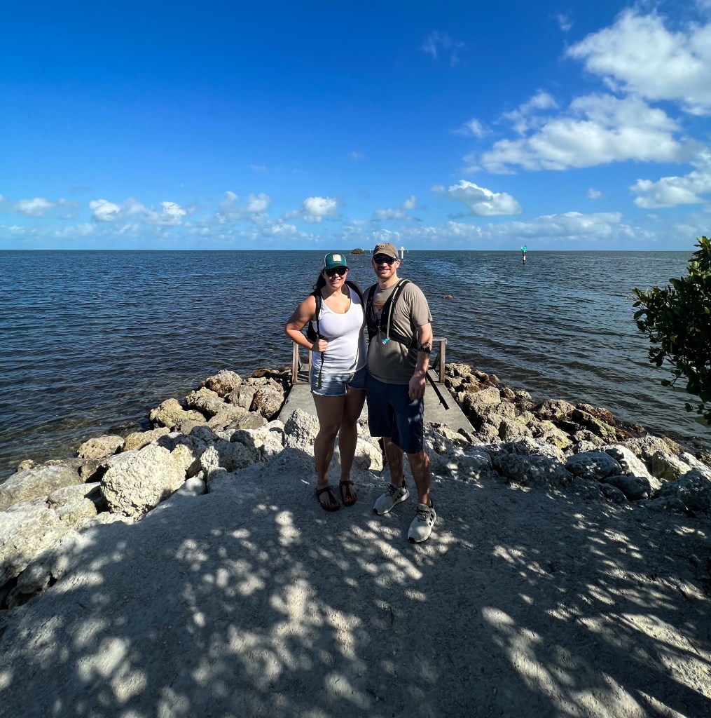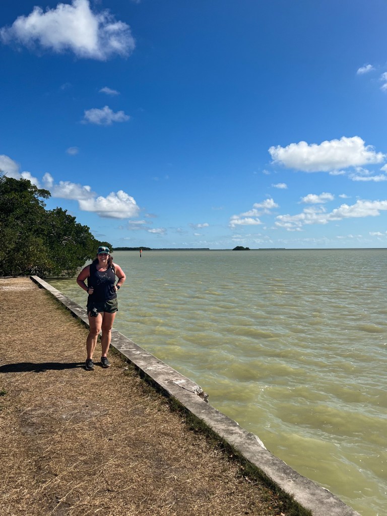We left on a Tuesday and landed in Miami in the early afternoon. It was an uneventful drive to Homestead, where we’d be staying during our trip. Biscayne National Park is 95% underwater, so there are limited parts of the park above water. We figured we could go there that afternoon and see what we could. We walked along the water and did the Jetty Trail past mangroves and palm trees. The trail is short, flat and easy, just under a mile round trip. I was just wearing my Birkenstocks at this point and had no issues. We walked to the end of the trail where the jetty abruptly ends. We spoke to a park ranger there who said that the jetty had previously been longer but a hurricane has ruined it in the past and they didn’t repair it as multiple seabirds had taken over the ruins and it was now a colonial bird protection area.
