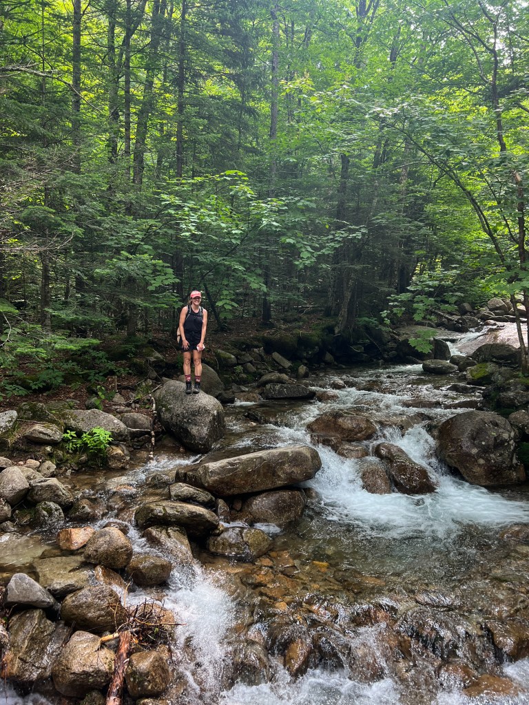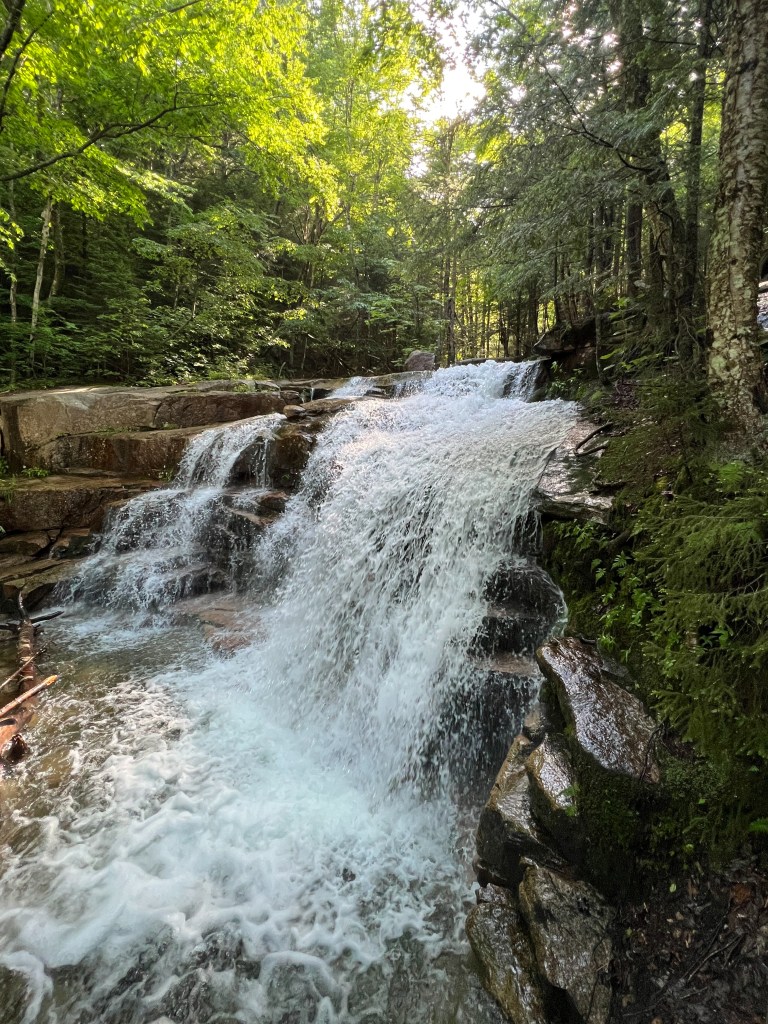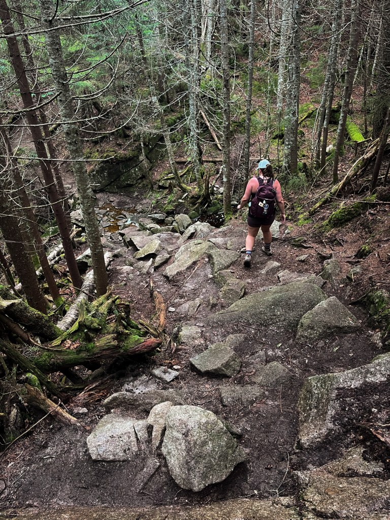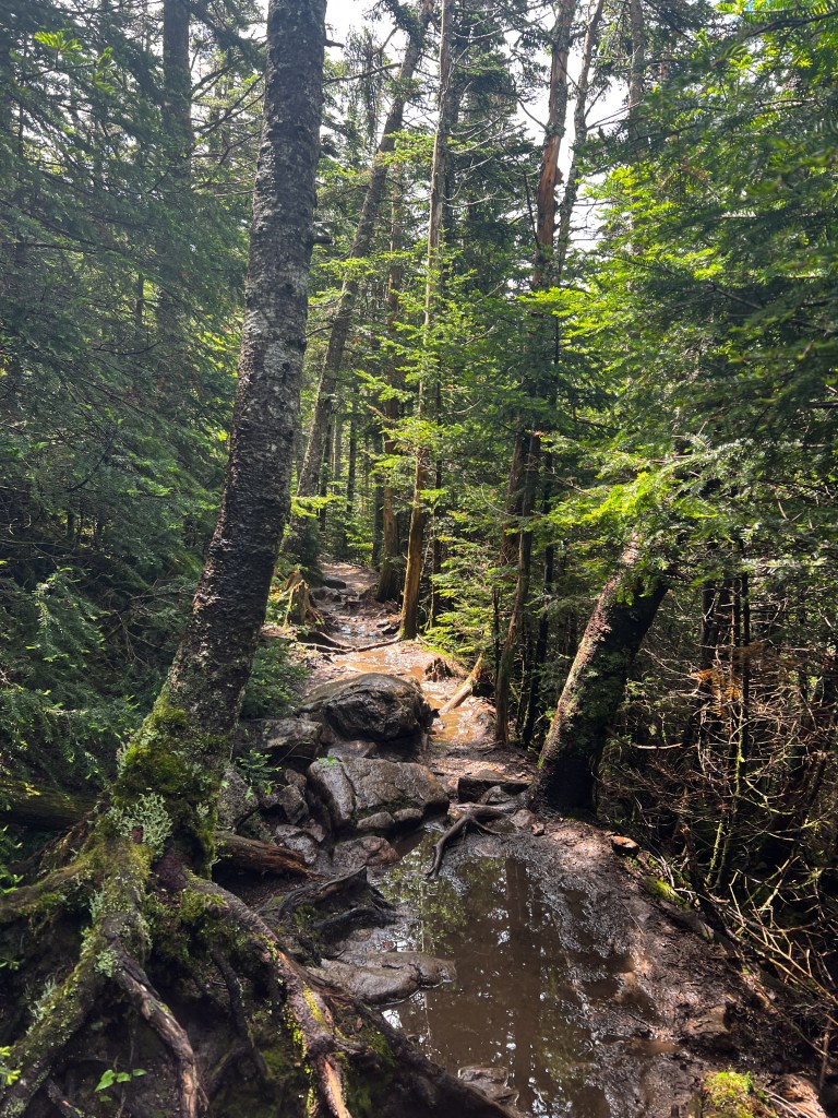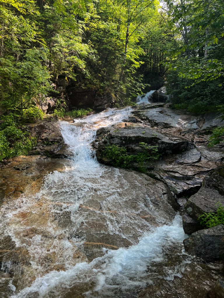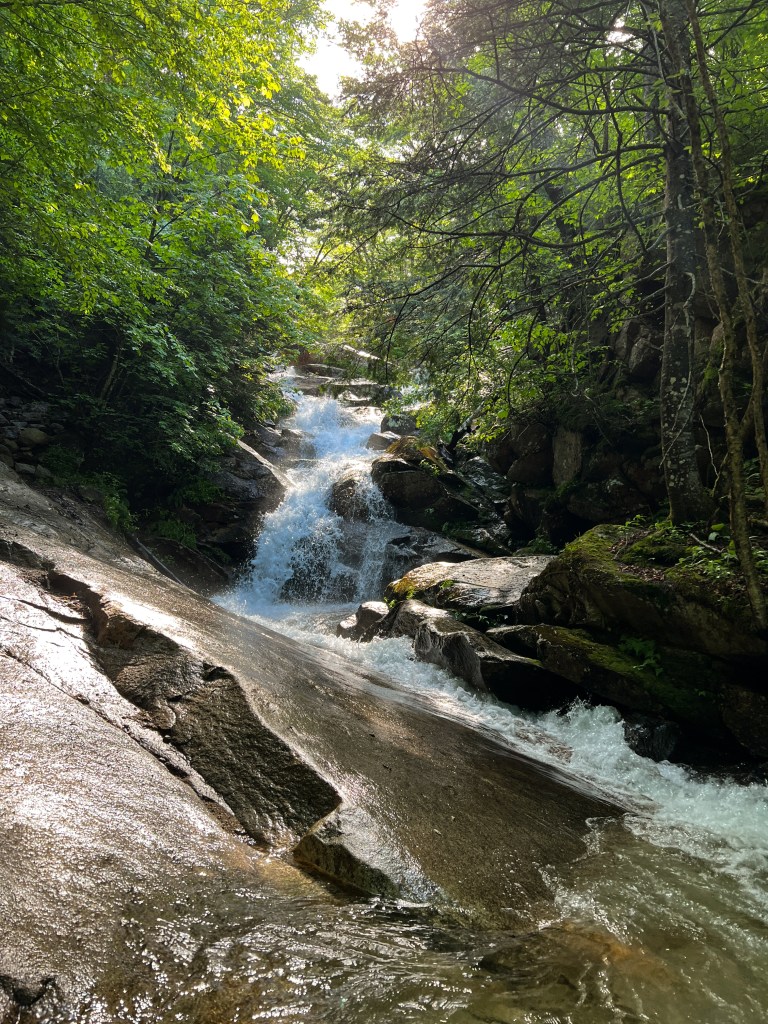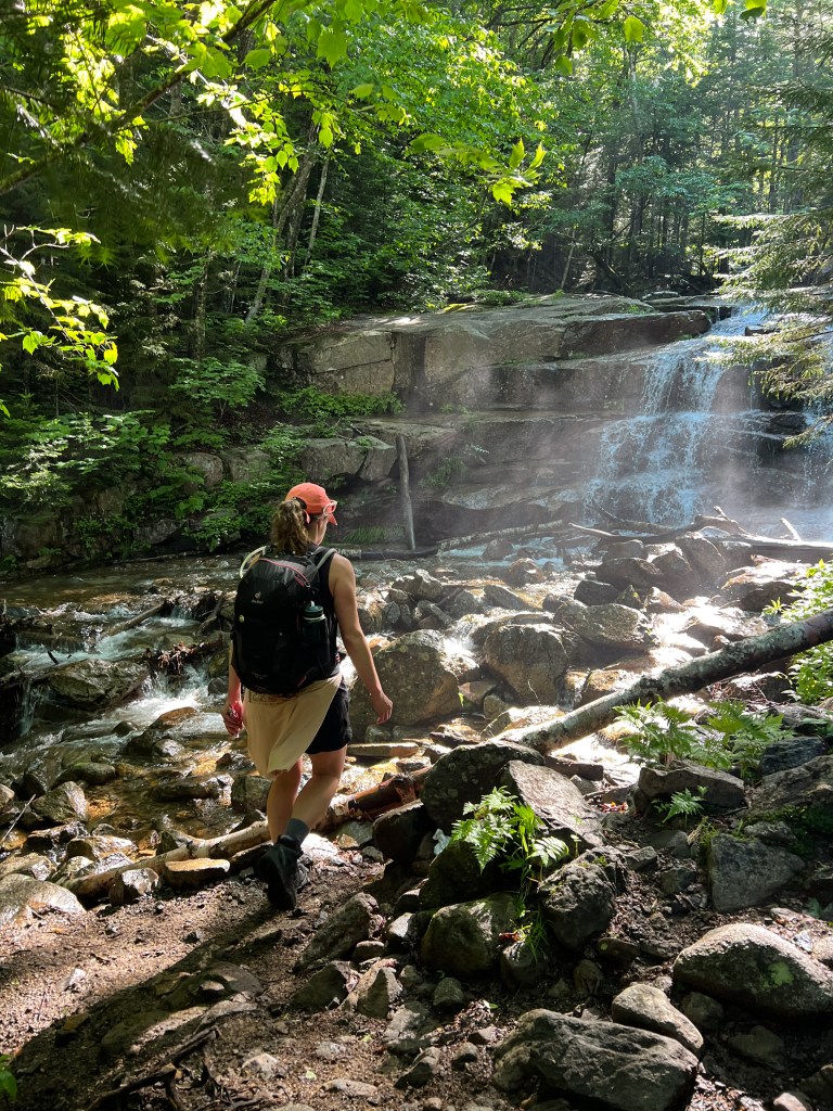We got to the trailhead early because we knew the parking lot was going to fill up fast since the trail is so popular. You can find the Franconia Ridge loop on AllTrails if it’s something you’d like doing yourself. When we went, it was at the end of June and we had gotten so much rain that month. While it did create some muddy sections, it was all worth it. There were a few designated waterfalls along the way but for most of the hike there was cascading water alongside the trail. It was stunning and made amazing background noise as you hiked through the woods. After we made it passed the falls, the trail started to get a lot steeper! There was a section that made me consider my life choices a few times. Once we made it to the alpine zone I was able to catch my breath, then at the summit of Little Haystack we paused for lunch. Unfortunately this peak doesn’t count as a 4,000 footer due a prominence rule that designates which peaks count, but the views are still beautiful! If you do this trail, I suggest wearing waterproof boots or bring extra socks because there are a lot of water crossings, especially in the spring.
