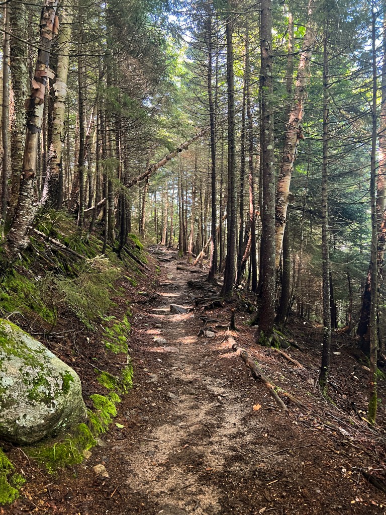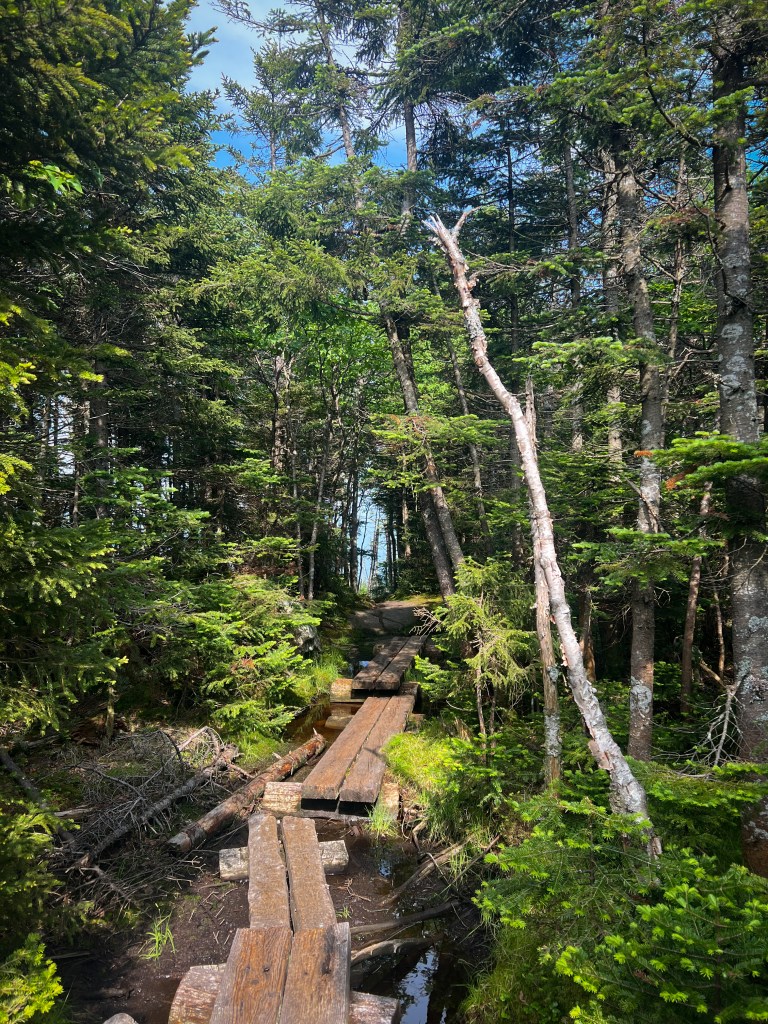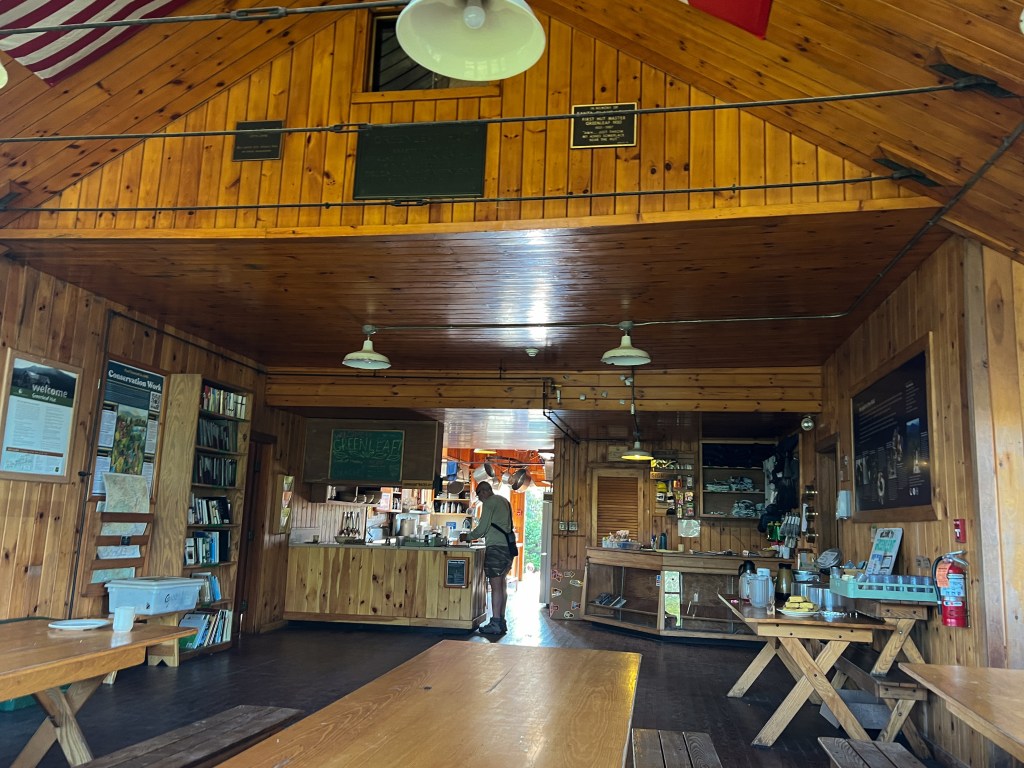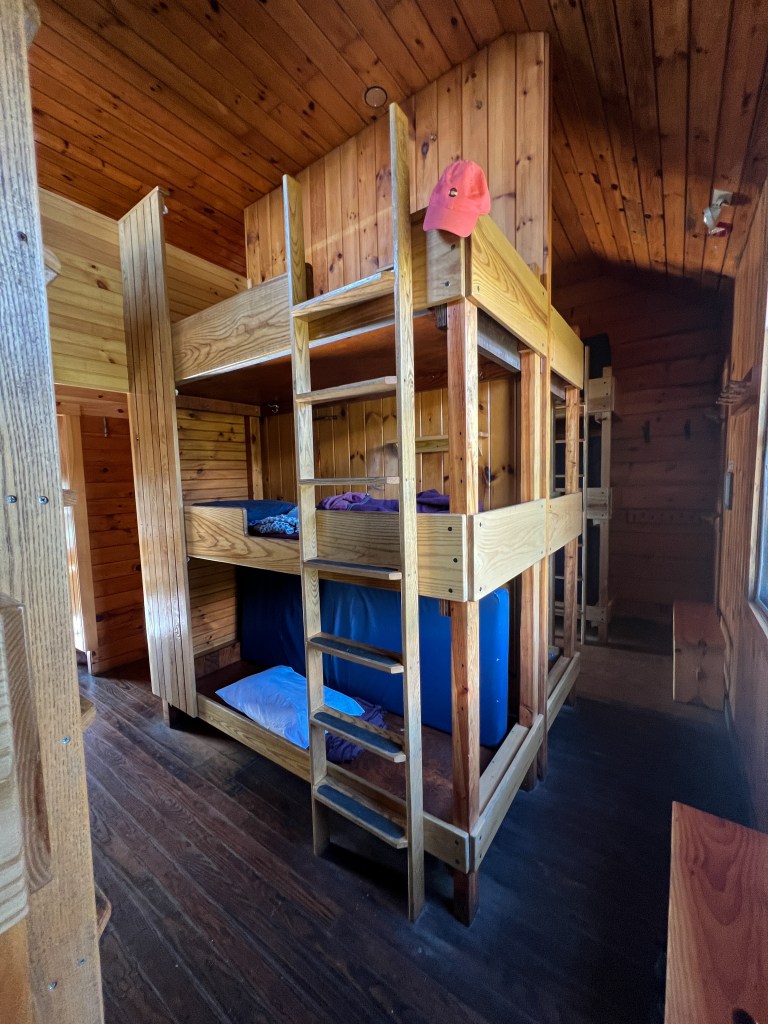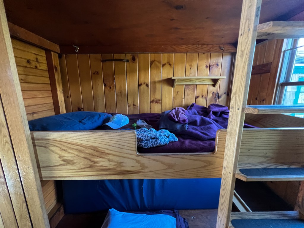 We reached our home for the night around 4 pm. It was everything I wanted it to be. The hut was very rustic. They had composting toilets and cold water sinks but no showers. The hut is also a pack in and out facility so there is no trash available. When preparing for a hut hike, you need to consider that when packing. There was a large kitchen and gathering area with big tables. They had some private bunk rooms and then they had other bunk rooms that were shared spaces. The bunks were 3 beds high. We had one of the shared space bunk rooms but luckily for us, the night we were there we had it for ourselves! When we arrived we freshened up, put on some clean, cozy clothes and just hung outside chatting with other guests. At 6pm the hut served a large family style dinner and everyone staying at the hut sat together for dinner. The hut crew (or croo as they like to spell it) brought out each course and the food was surprisingly delicious! We had a rustic tomato soup with homemade bread, followed by a boreal salad, vegetarian pot pie, rice and charred corn. There was a dessert too but I don’t remember what it was. After dinner we could do whatever we wanted until quiet hours started at 9:30pm. We attempted to see a sunset but there was such a haze in the air that we couldn’t see much of anything. We talked to the naturalist who was working at the hut that weekend and flipped through the books in the lending library. There is no overhead lighting in the lodge but each bunk had a small reading lamp so you could read in bed. It was such a unique experience. It wasn’t the most comfortable bed but we were so tired we fell asleep easily. Breakfast is served at 7am sharp. The croo wakes the whole hut up at 6:30am. When we were there, we were woken up to the croo singing “By and By” by Caamp, which was honestly a lovely way to wake up. Breakfast was served family style as well. They provided oatmeal, scrambled eggs, sausage, a delicious fruit bread, plus juices, tea and coffee. It was a nice hearty meal to start our next day of hiking.