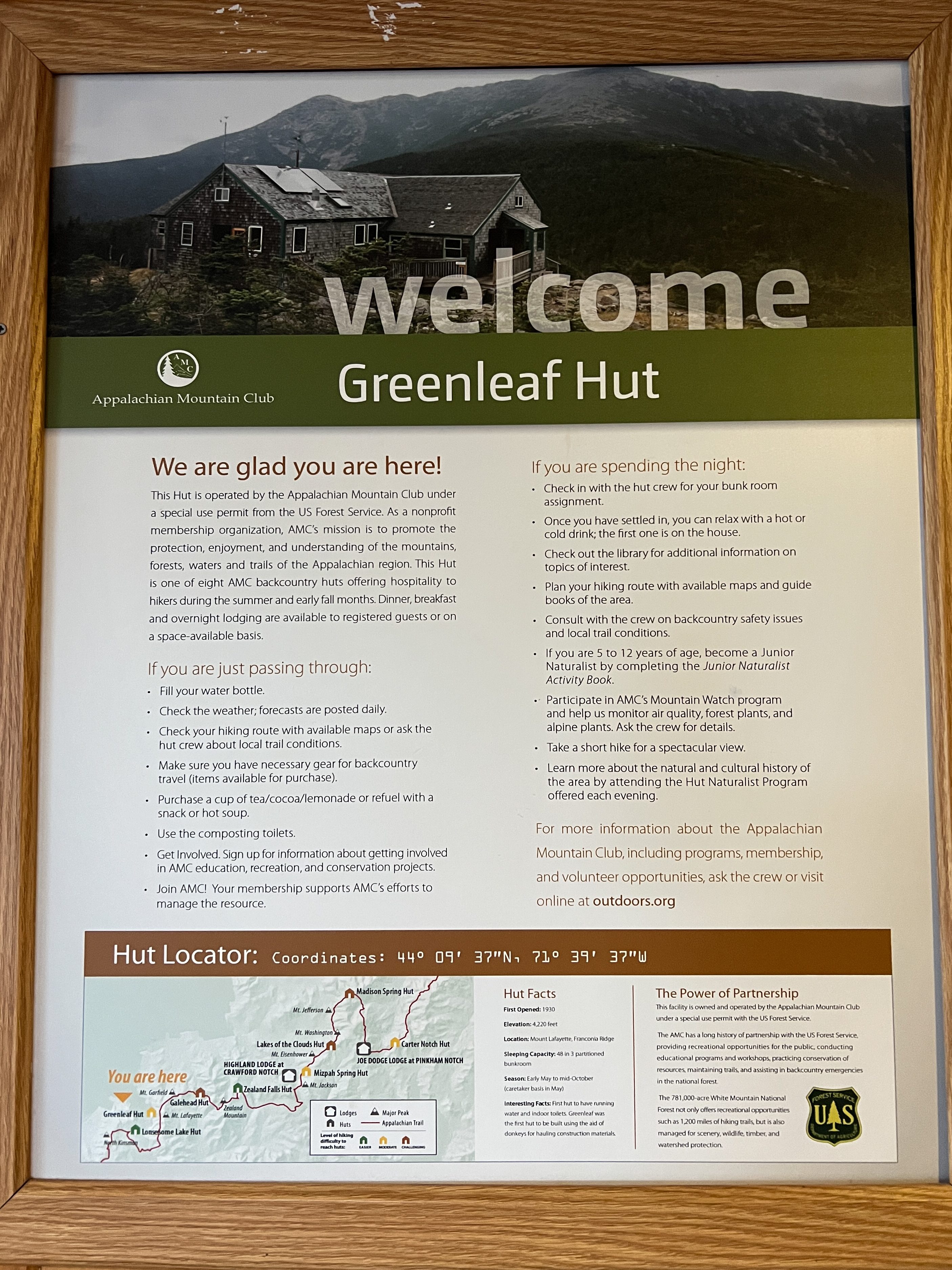 Franconia Ridge is a well-known hiker destination in New Hampshire which connects 4 of the 48 4,000 footers – Flume, Liberty, Lincoln and Lafayette. We didn’t hit Flume or Liberty but we could see them down the ridge. The hike across the ridge was incredible. I felt like I was on top of the world! You could turn in a full circle and everywhere you looked, there were mountains as far as the eye could see. Luckily we hiked on a Friday so it wasn’t as crowded as it might have been if we were there on a Saturday. You’ve probably seen pictures of the ridge online as it’s one of the most beloved hikes in New England. The second peak we came to on the ridge was Mt. Lincoln and my first official 4,000 footer! . We continued along to the highest summit on the ridge, Mt. Lafayette and took pictures with the summit sign. From here, you can either head down to the Greenleaf Hut (which was our destination), continue along the ridge to hit other peaks or complete the whole Pemi Loop traverse if you are really motivated (Backpacker magazine ranked this the second hardest day hikes in America!).