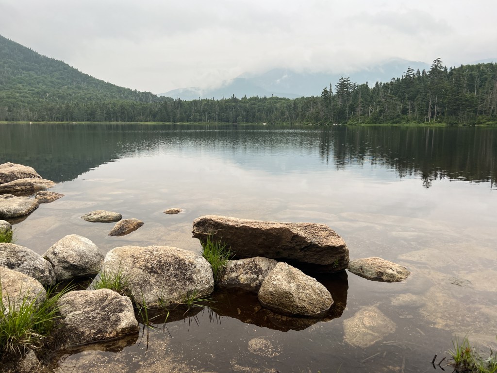 We left the hut around 8am to start our hike down the mountain. As we dropped a little in elevation, it got really foggy. While it blocked the views, I thought it made things look so dramatic and beautiful. This trail was pretty muddy and wet too. The rocks were very slick so we did lots of crab-walking down the rocks. The rocks in general were the stars of this trail. There were so many different types and colors. It was a great way to start the day. Once we got back to the parking lot where the car was, the fog was gone and the sun was out. We ditched our trash and smelly clothes at the car, grabbed a new set of clothes for the next day and then headed across the street to start the hike to our next hut. The hike up wasn’t too long, a little over a mile I think, but it was steep! We were still feeling pretty good at this point though so we powered along until we got to Lonesome Lake. I’ll go into a little bit more detail about the lake and the hut later, but first I need to talk about Fishin’ Jimmy.