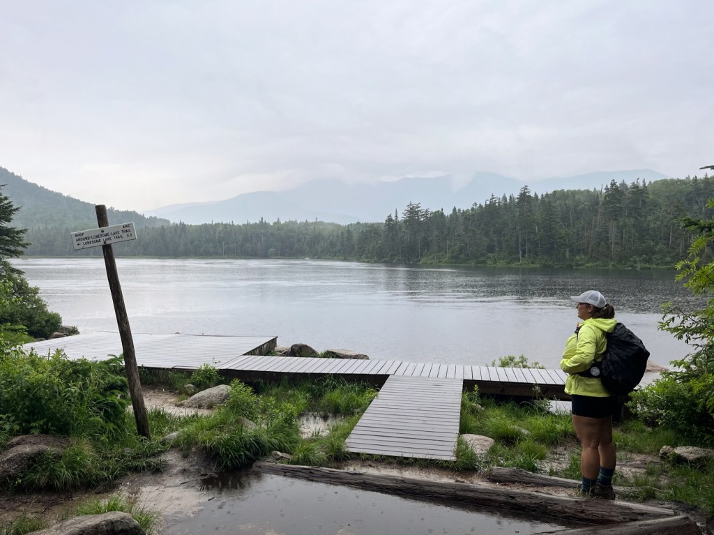 The hut was the same kind of rustic that Greenleaf was, however the main hut with the kitchen and gathering space was separate from the bunk houses and bathroom. They had bunkhouses of mixed sizes. We were in a bunk house with 4 beds so Liz and I knew were were going to be sharing with 2 strangers. It turned out our roommates were a couple in their late 70s named Phoebe and Bob and they were the best people ever. Phoebe was a hiking queen and had done a 100mile backpacking trip a few years prior. Bob preferred biking but Phoebe said she could usually convince him to hike with her a few times a year. They were funny and just the typical old married couple that you’d expect. We couldn’t ask for better roommates. I didn’t love having to walk outside to get to the bathroom, I was so nervous I’d have to get up at 2am to go and I’m such a baby about the dark. After dinner, we went down to the lake to put our tired feet in the cool water and enjoyed the peace and quiet. This hut had quiet hours like Greenleaf did. I don’t even think Liz and I made it anywhere close to that – we both were passed out before 9am. At 6:30am the next morning, we were woken up by one of the croo playing guitar on the roof of the main hut, which was another lovely wake up call! Again, we had a big breakfast and filled up before starting our return hike to the car. Right when we started our descent it started raining. Honestly I hadn’t hiked in the rain before and I found it really beautiful!