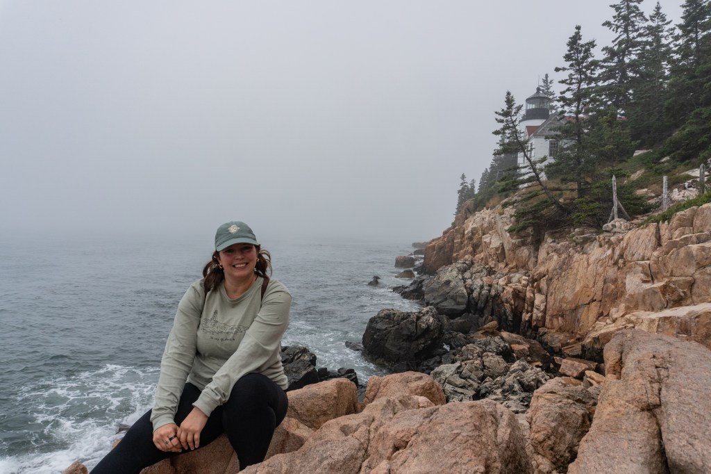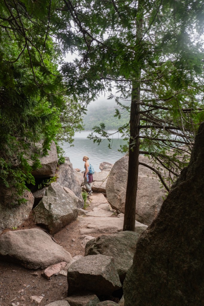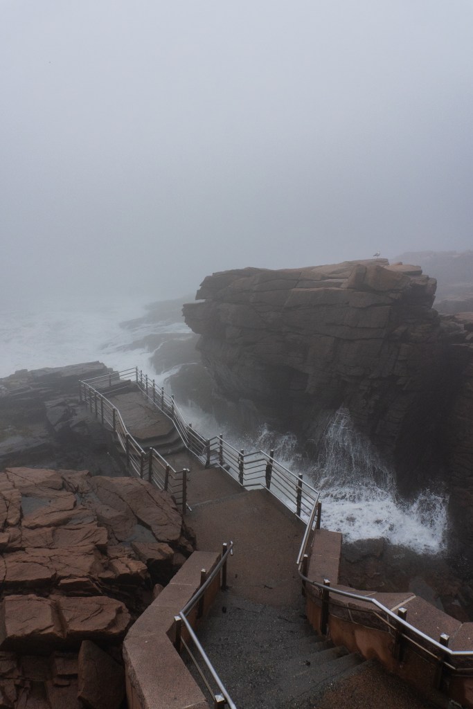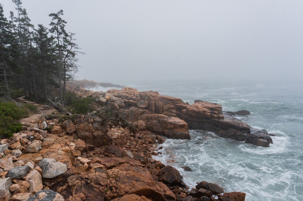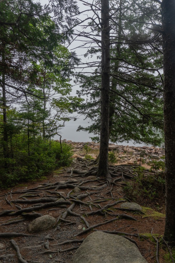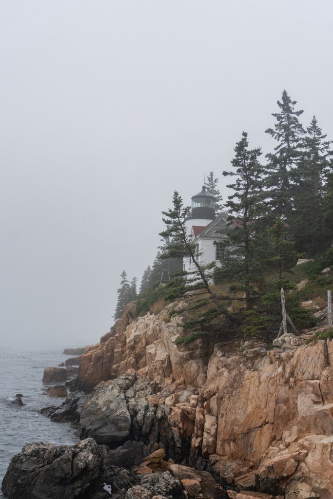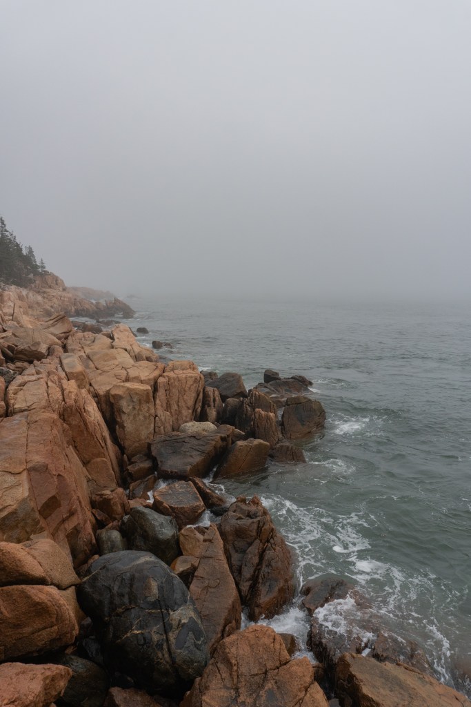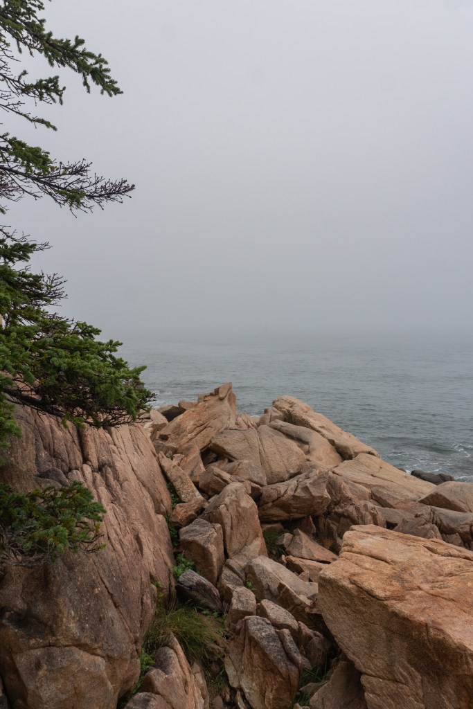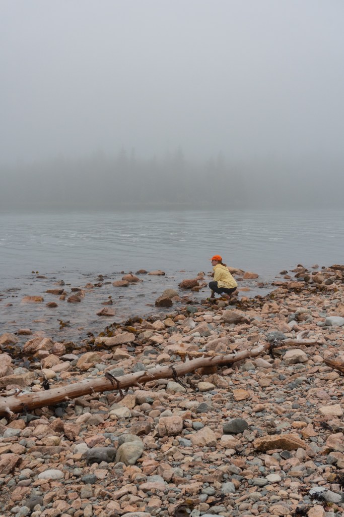 We all started the next morning at Cadillac Mountain for sunrise, but we didn’t have good luck and were socked in at the summit. However, on our ride back down the summit road, the fog started to part and we got to see beautiful cloud inversions. Some people went rock climbing afterwards and the rest of us went to see Bass Harbor Head Light, one of the well-known lighthouses in the park. It was pretty and the overcast skies gave it a dramatic vibe. Then we went over to Ship Harbor Trail, which was a new hike for me. It was easy, but I really enjoyed it and it had some gorgeous, moody views. We all reconvened back at the campsite for lunch.