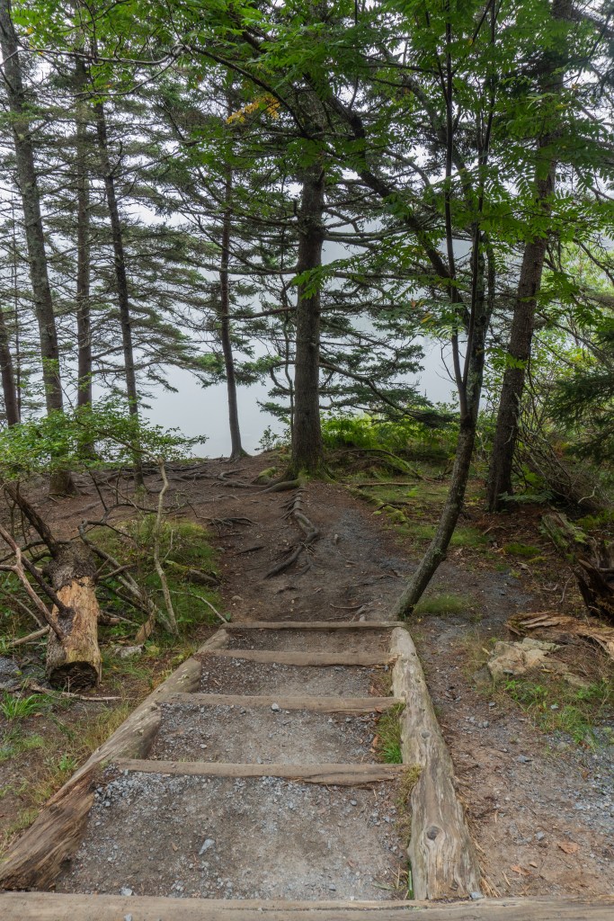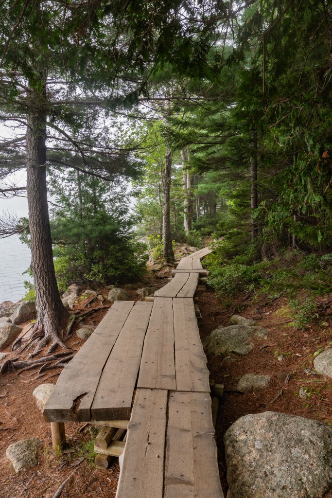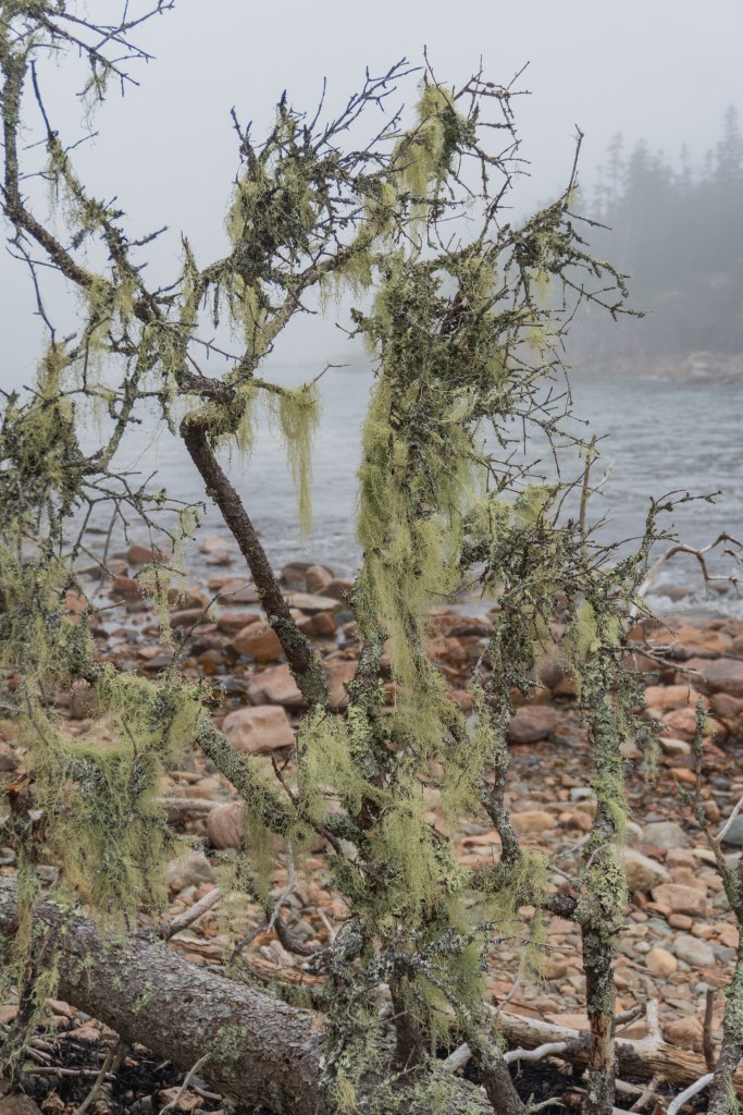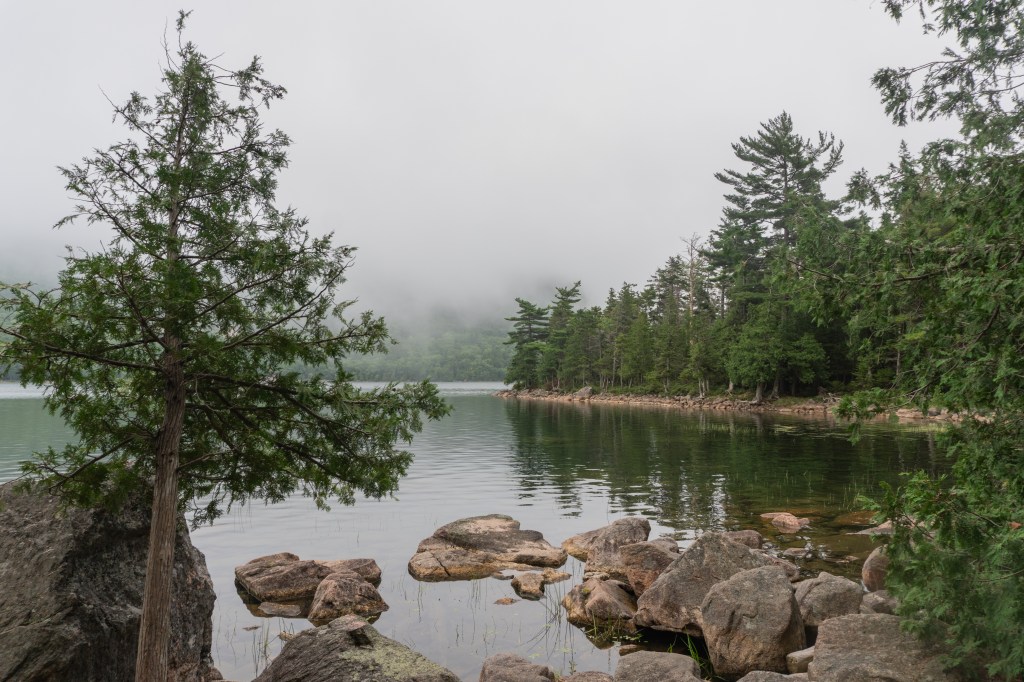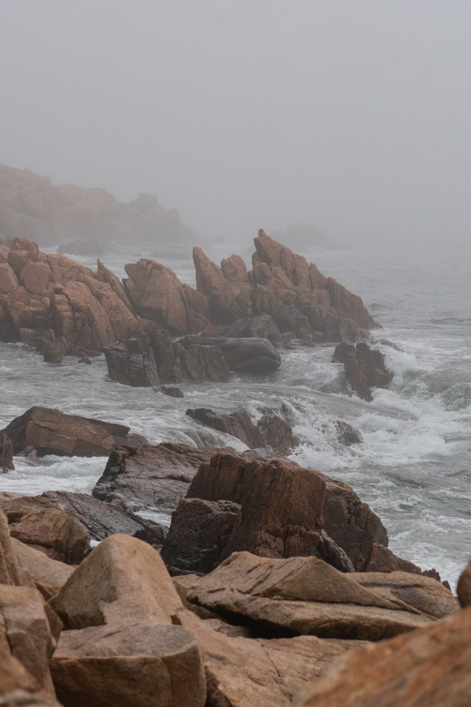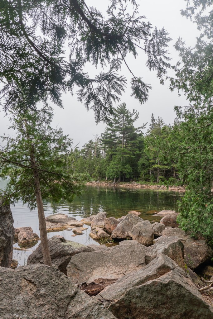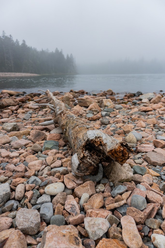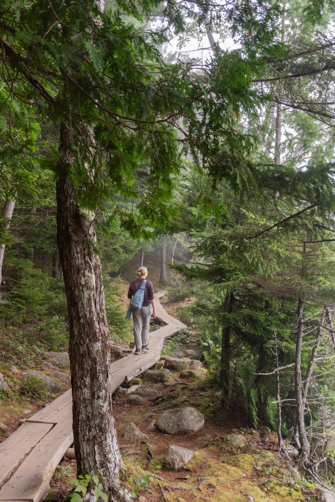 We all started the next morning at Cadillac Mountain for sunrise, but we didn’t have good luck and were socked in at the summit. However, on our ride back down the summit road, the fog started to part and we got to see beautiful cloud inversions. Some people went rock climbing afterwards and the rest of us went to see Bass Harbor Head Light, one of the well-known lighthouses in the park. It was pretty and the overcast skies gave it a dramatic vibe. Then we went over to Ship Harbor Trail, which was a new hike for me. It was easy, but I really enjoyed it and it had some gorgeous, moody views. We all reconvened back at the campsite for lunch.