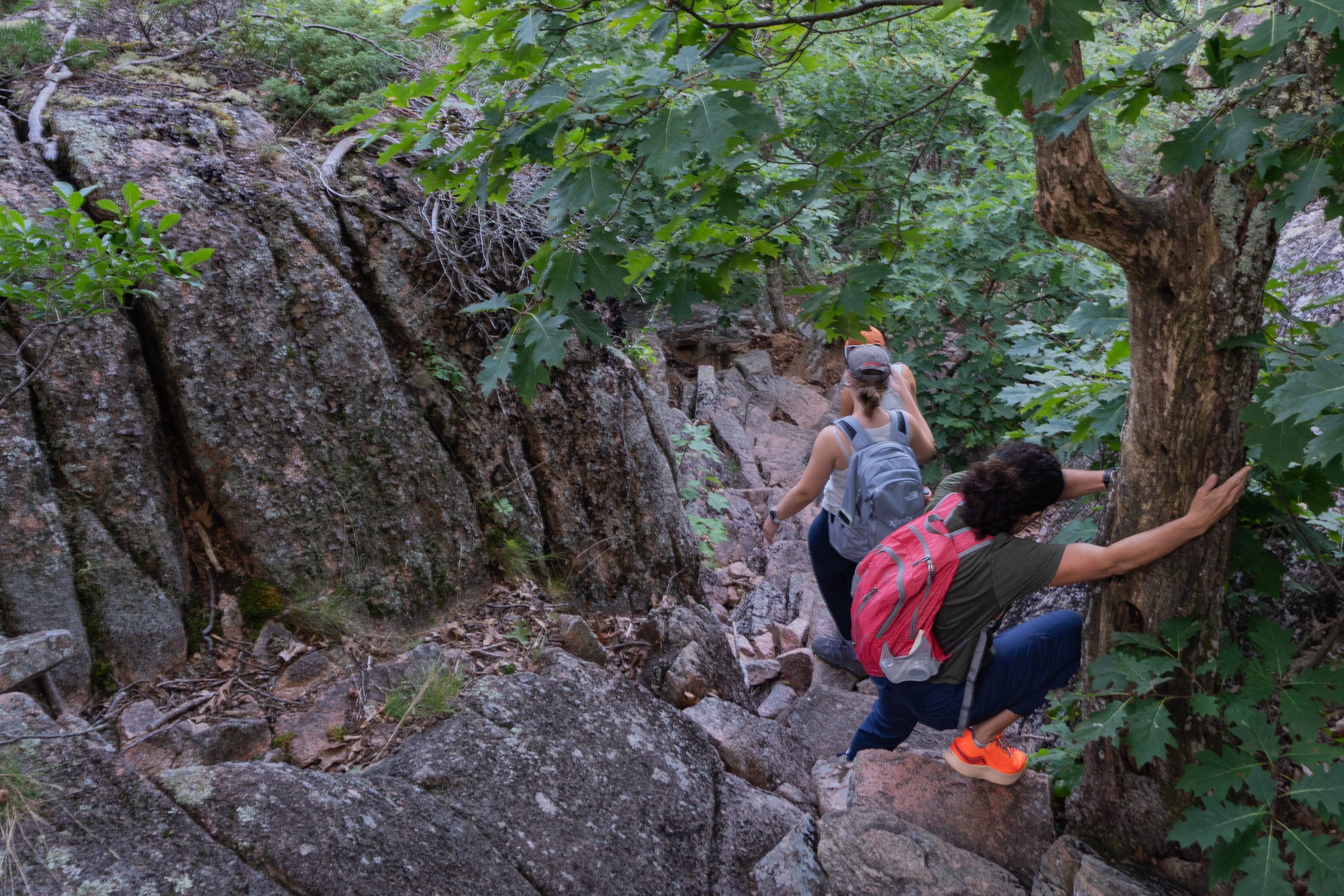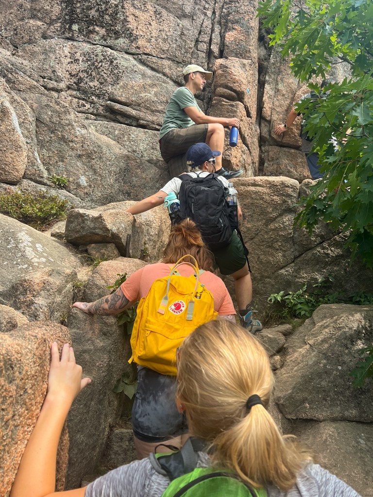 The second day of the trip, we got an early start. We had breakfast at the hotel and then loaded up the two passenger vans and trailer and headed north. It would take us a few hours to make the drive from Portland to Bar Harbor. We stopped for a bathroom break and to stretch our legs in Damariscotta but hit the road again shortly after. We took a longer break in Camden and grabbed lunch downtown along the water from a popular deli. We finally made it to the Bar Harbor area, a little behind our original arrival time. We were supposed to be doing a quick hike up Dorr Mountain before setting up camp at the campground.