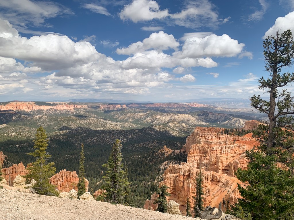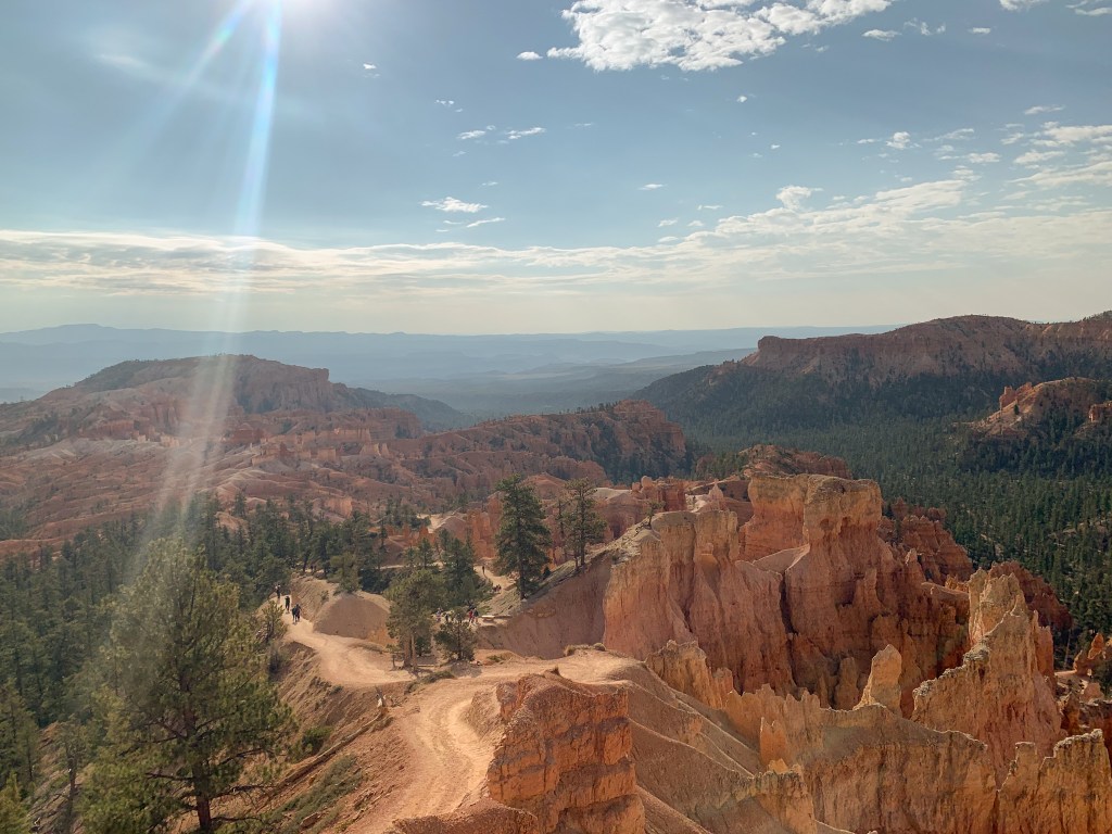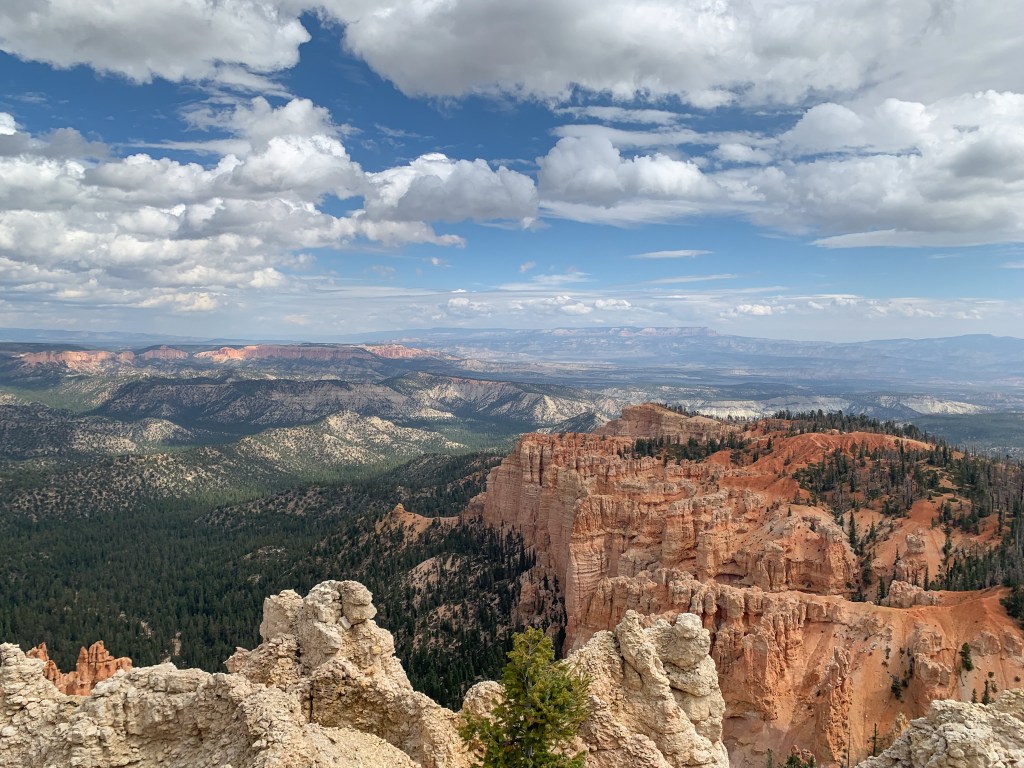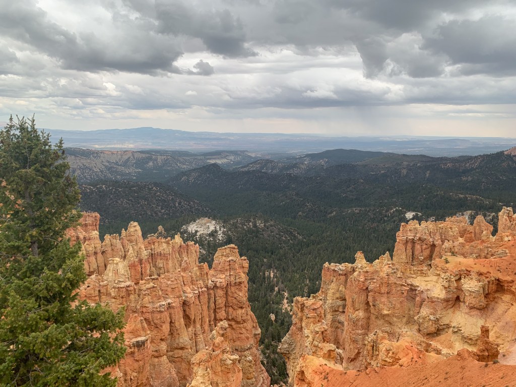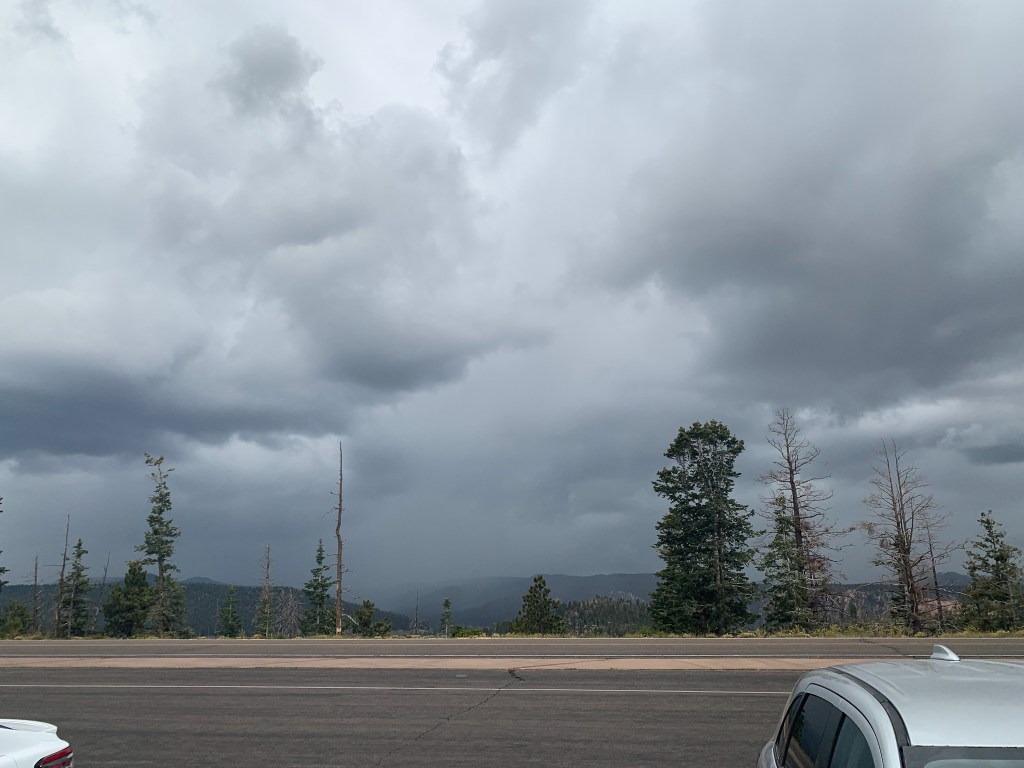 What stood out most to me was the contrasting colors. The orange and tan hoodoos against the bright blue sky with dashes of green from bristlecone pines and the puffy white clouds really set the most beautiful scene for a hike. We unfortunately had our time here cut short by a huge storm. It was some of the craziest rain I’ve ever seen! We ate lunch in the car to see if the rain would pass but it didn’t 😞 We ended up leaving the park earlier than intended. I have so much more to explore there so I will definitely be making a return trip. It’s such a stunning park!
