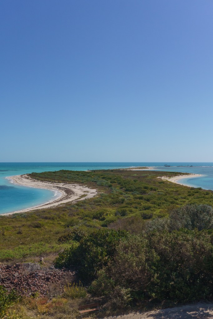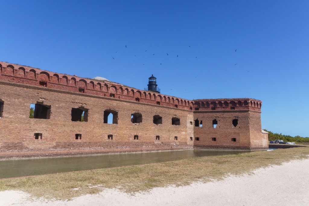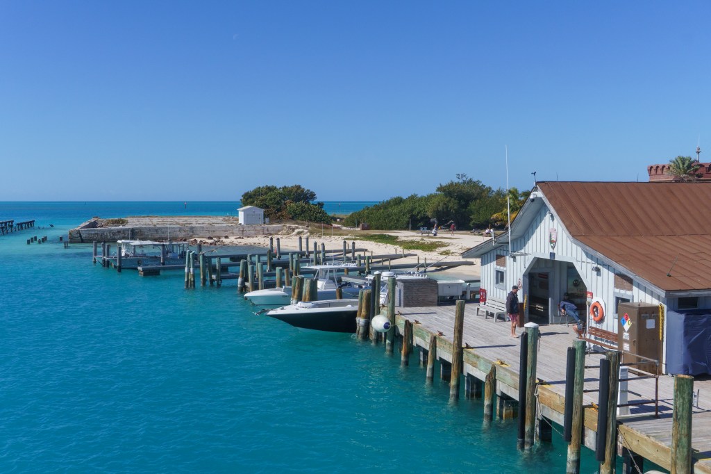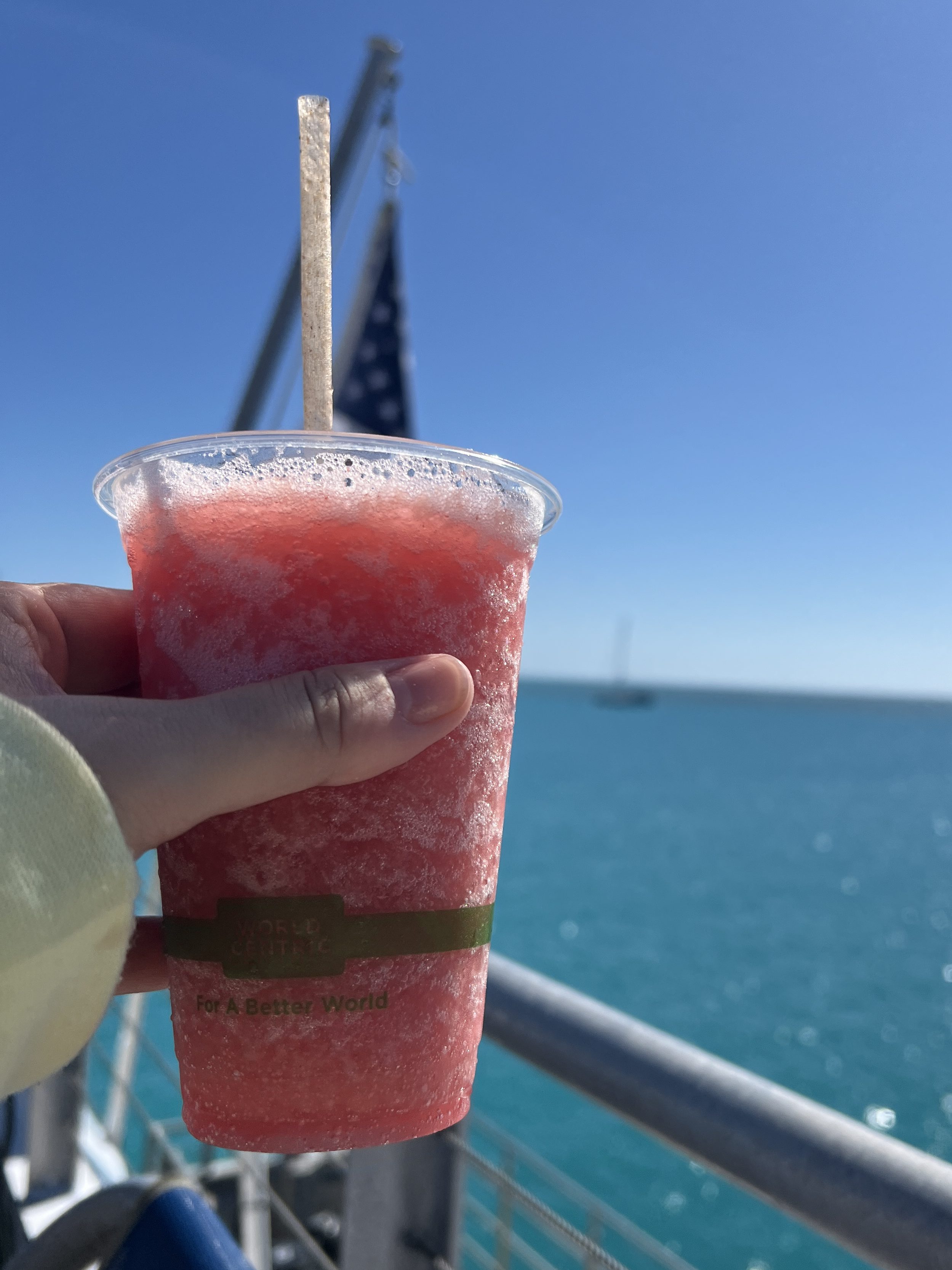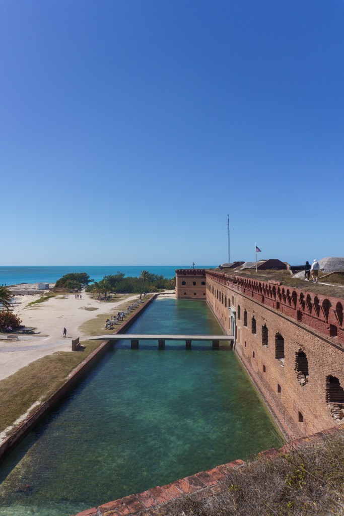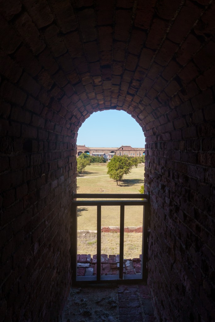 Day three was a busy day for us. We woke up early and rode our bikes about three miles to the marina where the Yankee Freedom, the ferry that would take us to Dry Tortugas National Park, was docked. We arrived right at 7 AM and checked in. Boarding happens in numerical order of when you arrive and check in. Since we checked in right at 7 AM, we were able to board before a lot of other people and scored a seat on the upper deck of the ferry. Breakfast was provided on board (bagels and cream cheese, fruit, coffee, tea, etc.). The ferry ride was a little over two hours long. During the ride, the park ranger would pop on over the loud speaker and point out different things, like landmarks and protected areas. Once we arrived at the park, the park ranger offered a 45-minute tour of the first level of Fort Jefferson, the large historical fort on the island, or you could do your own self-guided tour of all three levels, which is what we did. We started by visiting the tiny park store and then explored the fort. The roof level was really interesting with multiple cannons and little hidden passageways. The water around the island was stunning, I couldn’t get over how bright blue it was.